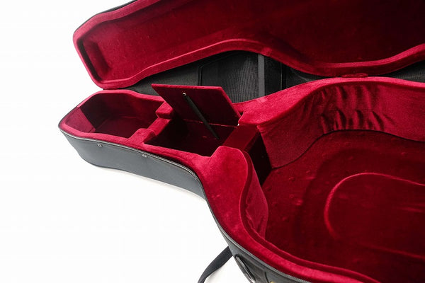 楽器に接する内装生地は、柔らかく塗装に影響しない高級素材を採用。生地色はレッド(ブラック、ブルー、ブラウン、バーガンディに使用)と、ブラック(アイボリー、オレンジ、スティールブルーに使用)の2種類があります。