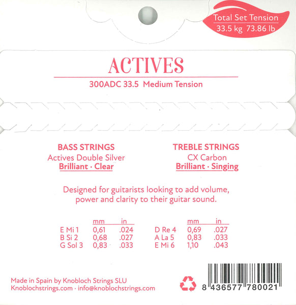「1, 2, 3弦:フロロカーボン(CX Carbon)」「4, 5, 6弦:ダブルシルバー(Actives Double Silver)」のミディアムテンションセット