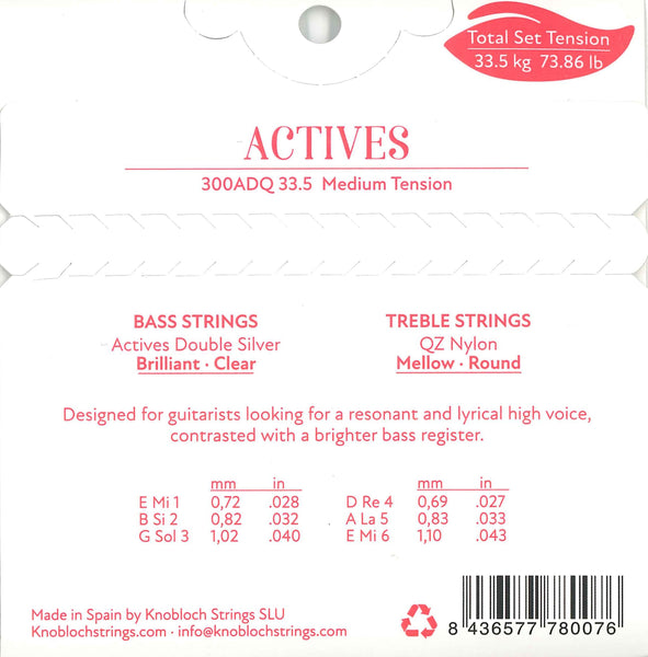 「1, 2, 3弦:ナイロン(QZ NYLON))」「4, 5, 6弦:ダブルシルバー(Actives Double Silver)」のミディアムテンションセット