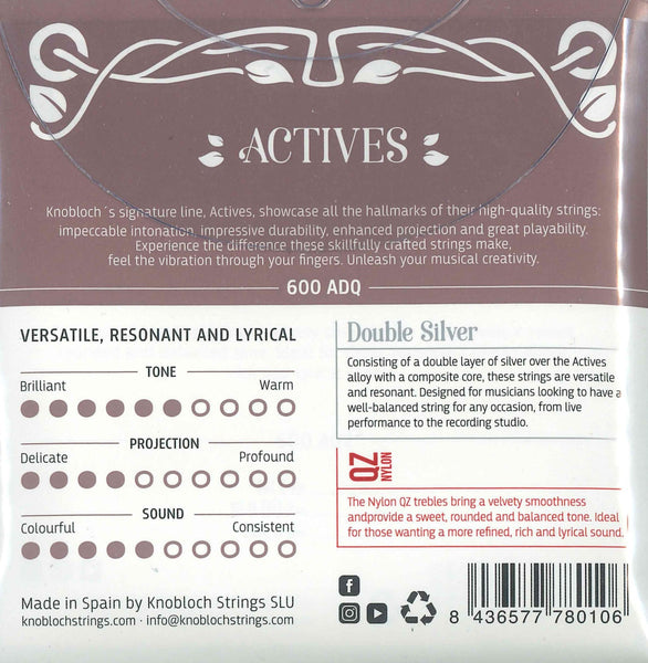 「1, 2, 3弦:ナイロン(QZ NYLON))」「4, 5, 6弦:ダブルシルバー(Actives Double Silver)」のスーパー・ハイテンションセット