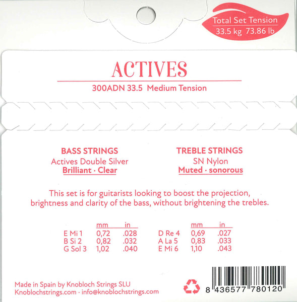 「1, 2, 3弦:ナイロン(SN NYLON)」「4, 5, 6弦:ダブルシルバー(Actives Double Silver)」のミディアムテンションセット
