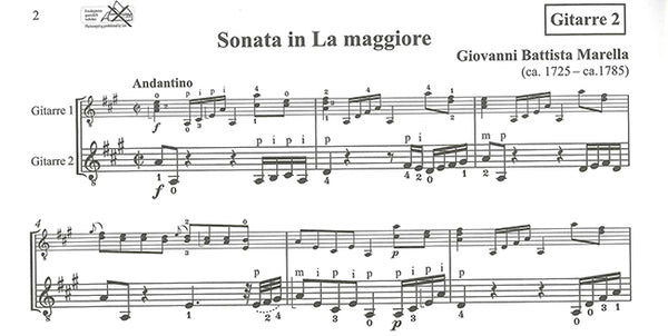 18世紀半ばに活躍したヴァイオリン奏者兼作曲家のジョヴァンニ・バッティスタ・マレッラの作品。本作は、アンダンティーノ、ラルゴ、メヌエットの3楽章からなる変則的ソナタ形式の作品。メヌエットは、二重奏の主題と5つの変奏からなっており、ギター2は通奏低音。スコア、ギター2用のパート譜付き。