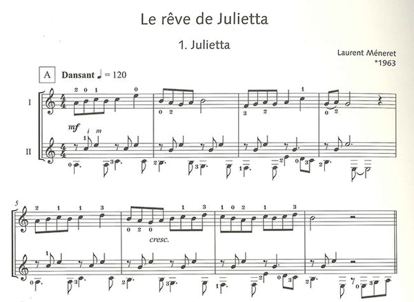 フランス人ギタリスト、作曲家、ローラン・メネレ。本作は、南スペインに住んでいるジュリエッタを主人公にした4つの物語。比較的やさしめの二重奏曲です。スコアが2部入っています。