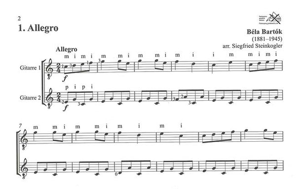 1904年〜1936年、ハンガリー、ルーマニア、スロバキア、北アフリカなどで民謡の収集をしていたバルトーク。その膨大な曲と経験をもとに、教育的ピアノ作品「子供のために」を作りました。1908〜9年に作曲され1943年に改訂されている、この有名なピアノ作品を、ジークフリート・シュタインコグラーがギター二重奏に編曲しました。このギター二重奏版も、初心者同士でも楽しめる易しい編曲で、ピアノ版と同様、教材として使える一冊です。全38曲収載。