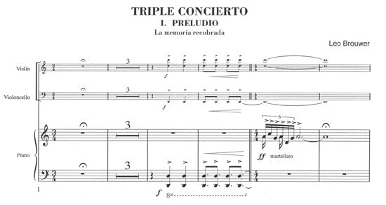 【楽譜】ブローウェル:三重協奏曲(Vn&Vc&Pf&Orch)前奏曲、悲しみのハバネラ、愉快な黒い瞳、の全3楽章。ソロパート譜のみ。