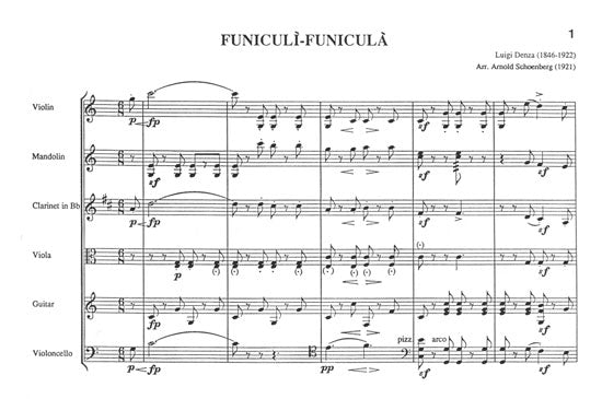 【楽譜】シェーンベルク:3つの編曲(デンツァ:フニクリ=フニクラ[Vn&Mn&Cl&Vla&G&Vc],シューベルト:セレナーデ[Cl&Fg&Mn&G&2Vn&Vla&Vc],シオリー:Weil I A Alter Drahrer Bin [Vn&Mn&Cl&Vla&G&Vc])。スコアとパート譜。1921年夏のバカンスで生徒と演奏するために編曲。シェーンベルク自身はVcを演奏