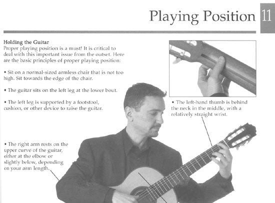 [メソッド編]各部の名称、構え方、チューニング、アルアイレ、アポヤンド、スケール、和音とアルペジョ、スラー、第1ポジションでの練習曲、第2、第5ポジション、ハーモニクス、トレモロ、装飾音など、[レパートリー編]ミラン、ダウランド、バッハ、サンス、ド・ヴィゼー、カルカッシ、コスト、ジュリアーニ、ソル、シューマン、サティ、タレガなどの作品、全55曲。