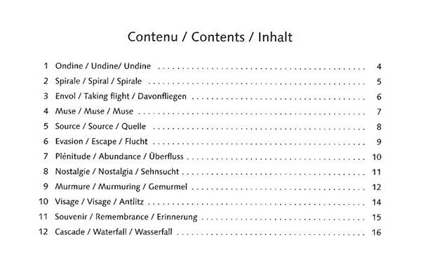 オンディーヌ Undine / 螺旋 Spiral / 逃亡 Taking flight / ミューズ Muse / 源 Source / 脱出 Escape / 多数 Abundance / ノスタルジア Nostalgia / つぶやき Murmuring / 顔 Visage / 記憶 Remembrance / 滝 Waterfall