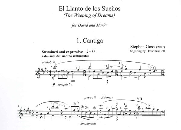 スティーブン・ゴスは、ギターだけでなく様々な作品を手がけ、世界中から注目されている作曲家の一人。ジョン・ウィリアムズやデイヴィッド・ラッセルなどもゴスの作品をCDに収録するなど、ギター界でも話題の人物です。本作は、「Cantiga」「Madrugada」「Alborada」の三部からなるデイヴィッド・ラッセル夫妻に捧げられた1曲。フェデリコ・ガルシア・ロルカの詩から着想したというストーリー性に富んだ作品は、今後多くのプロにも愛奏されることでしょう。ラッセルのCD「フォー・デイヴィッド」に収録されています。中〜上級者向けの作品。