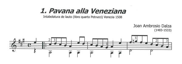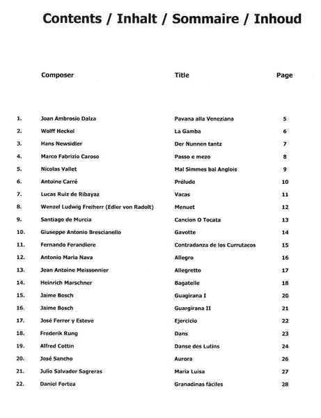 Joan Ambrosio/Dalza Pavana alia Veneziana,Wolff Heckel/La Gamba,Hans Newsidler/Der Nunnen tantz,Marco Fabrizio Caroso/Passo e mezo,Nicolas Vallet/Mal Simmes bal Anglois,Antoine Carre/Prelude,Lucas Ruiz de Ribayaz/Vacas,Wenzel ludwig Freiherr (Edler von Radolt)/Menuet,Santiago de Murcia/Cancion O Tocata,Giuseppe Antonio Brescianello/Gavotte,Fernando Ferandiere/Contradanza de los Currutacos,Antonio Maria Nava/Allegro,Jean Antoine Meissonnier/Allegretto,Heinrich Marschner/Bagatelle,Jaime Bosch/Guagirana I,Jaime Bosch/Guargirana II,Jose Ferrer y Esteve/Ejercicio,Frederik Rung/Dans,Alfred Cottin/Danse des lutins,Jose Sancho/Aurora,Julio Salvador Sagreras/Maria Luisa,Daniel Fortea/Granadinas faciles