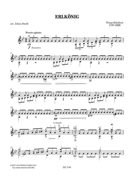 本作は、フランツ・シューベルト(1797 1828)が1815年に作曲した歌曲《魔王(Erlk nig)》D328を、ギター独奏用に編曲した楽譜です。
