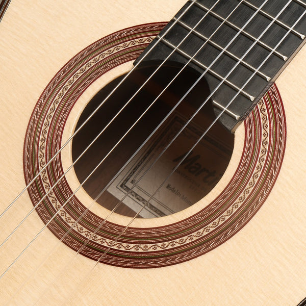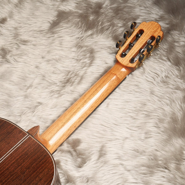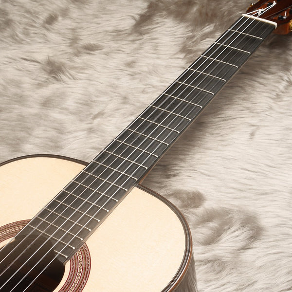 芯のある力強いサウンドを生み出す松の表面板と、豊かで深みのある響きを持つローズウッドの組み合わせにより、クラシックギターの伝統的な音色を余すことなく表現します。重厚で密度の高い低音と、よく鳴る中音域は、演奏に深みを与えます。