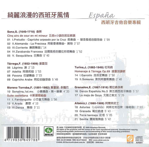 サンス:5つの宮廷歌曲ホ短調(プレリュード、アルマンド、クーランテ、サラバンド、セクスィアンテ)/タレガ:涙、アデリータ、パヴァーナ、アラビア風綺想曲/M=トローバ:ソナチネ〜第1楽章、カスティーリャ組曲/トゥリーナ:タレガ賛歌(ガロティン、ソレアレス)/グラナドス:スペン舞曲5番、ゴヤの美女/アルベニス:アストゥリアス、グラナダ、朱色の塔、セビーリャ