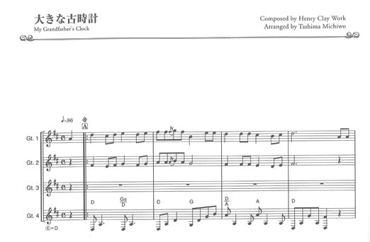 名曲の数々を四重奏、三重奏で。人気ギタリスト、田嶌道生による編曲です。学生からベテラン層までアンサンブルのレパートリーの充実のためにと制作された1冊です。パート譜付き。