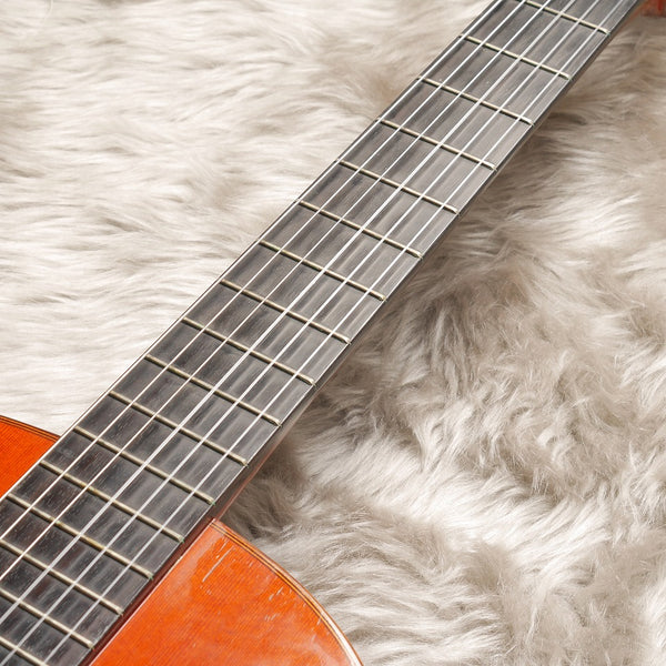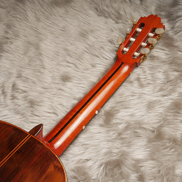 本器は、ホセ・オリベの工房にて丁寧に製作された一本で、杉の表面板ならではの、太く甘い音色が最大の特徴です。一音一音に温かみがあり、包み込むような豊かな響きを奏でます。