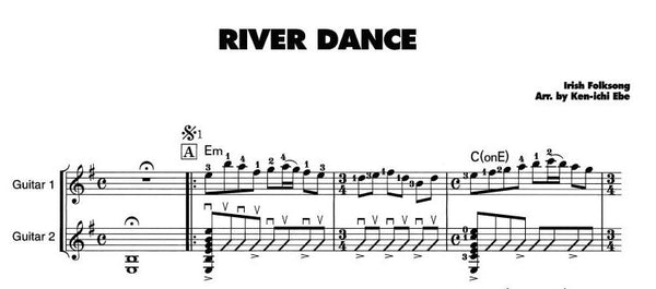 アイリッシュ(ケルト)音楽のなかでもシンボリックな位置にある人気曲です。〈リヴァー・ダンス〉をタイトルにしたダンス・ミュージカルの公演があったのも記憶に新しいところです。このアレンジはもちろん最低2人でも演奏できますが、できれば大人数でのアンサンブルがオススメです。ギターはもちろんフルートやバイオリン、リコーダ一、鍵盤ハーモニカなど身近な楽器を使って大ユニゾン大会をやってみるのもおもしろいでしょう。アンサンブルではこの変拍子をいかに合わせるかが最大のポイントです。ギター2のアクセントをはっきりと、メロデイーもメリハリを付けて演奏しましょう。またオンコードがたくさん使われていますが、むずかしい場合は省略しでもかまいません。
