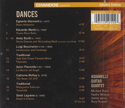 シャンドスと専属契約を結んだ本格派ギター・クヮルテット、アクアレル・ギター四重奏団のセカンド・アルバムは「ダンス」!クレイグ・オグデン、ゴードン・クロスキーに学んだギタリストたちによって結成されたアクアレル・ギター四重奏団のダンス・コレクションは、トラディショナル音楽、ボッケリーニから、ジスモンチ、イギリスのサクソフォン奏者アンディ・スコットの委嘱作品など豊富なバラエティが魅力。時代や形式に束縛されることなく、クラシカル・ギターの新境地を開拓し続ける4人が奏でる情感溢れるダンスミュージックをお楽しみ下さい!