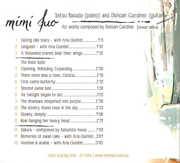 クラシックギタリスト、ダンカン・ガーディナーと、ピアニスト、増田 摂の二人のデュオ「mimi duo」(ミミ・デュオ)のファーストアルバムです。オーストラリアのパース在住の二人は、2012年にmimi duoを結成し、オーストラリアを中心に活動、2016年には日本でのコンサートツアーも成功させています。「Sakura」を除く、全ての作品をギターのガーディナーが作曲した本作は、二人のアンサンブルの素晴らしさと作品のクオリティーの高さも相まった、物語性のあるアルバムです。ギターとピアノという組み合わせ自体が多くない中、かつ良質のオリジナル作品を生み出しているmimi duoの存在は貴重であり、今後更なる活躍を期待されています。