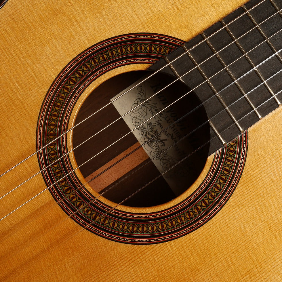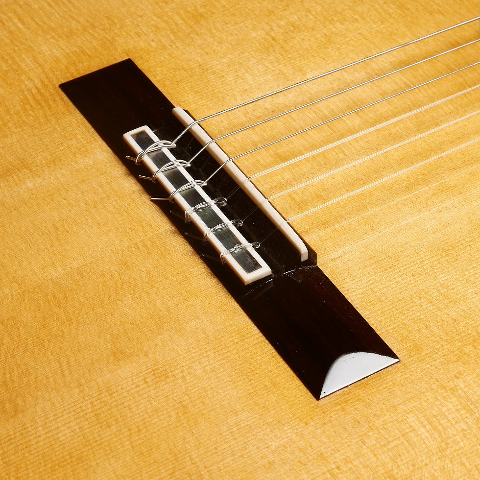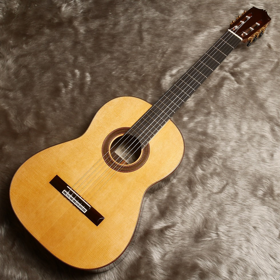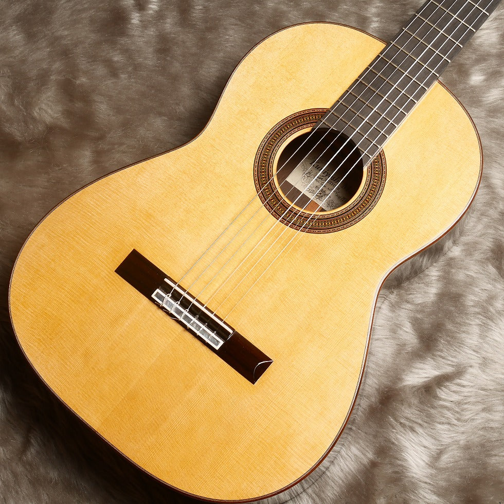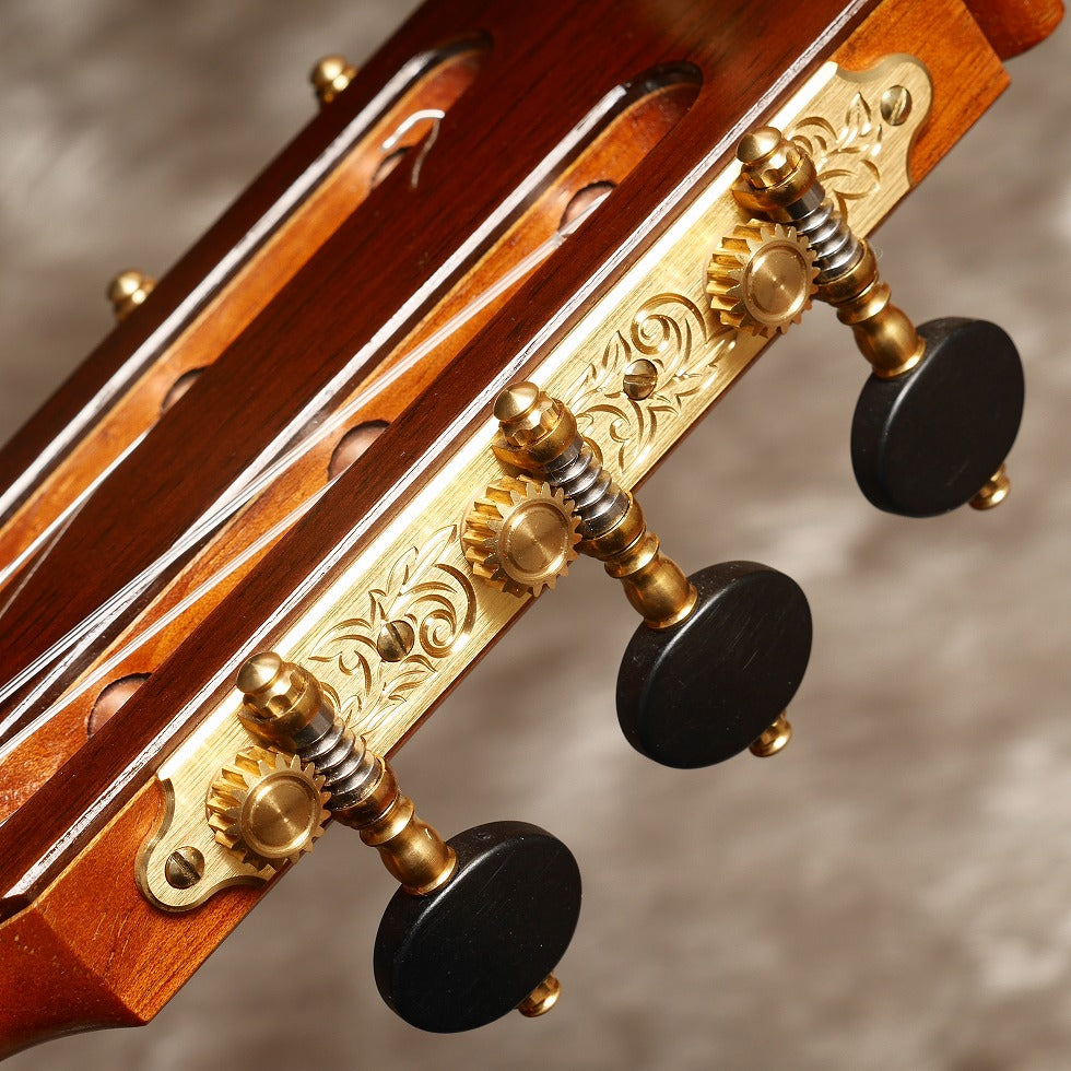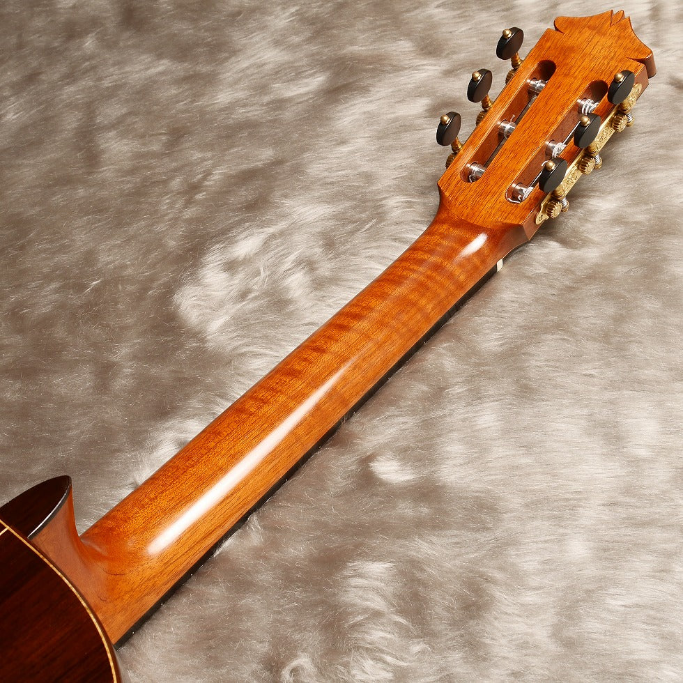 日本が誇る名工のひとり松井邦義製作のマルセロ・バルベロモデルです。ヘッド、ロゼッタ、力木の配置など細部にわたり忠実に再現している。音色はスペイン的なダイナミックな低音と抜けるような高音が特徴。本家のバルベロ程、弦のテンションは強くないので演奏性は優れている。セラックのタンポ塗で丁寧に仕上げられたこだわりの一本。