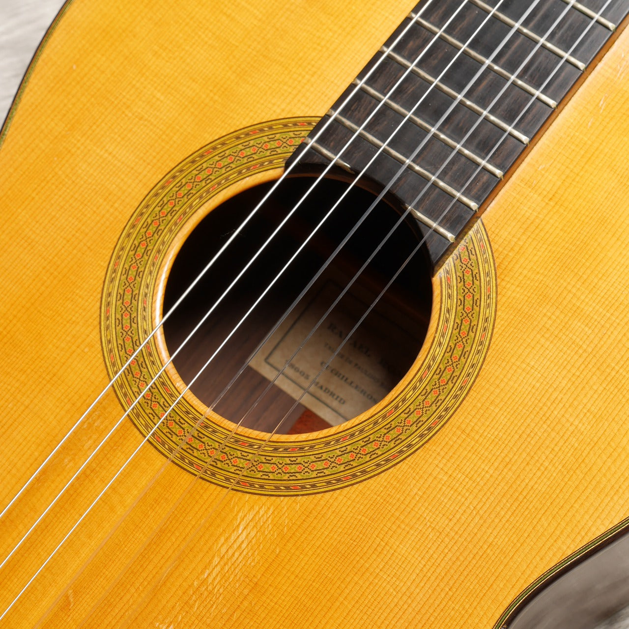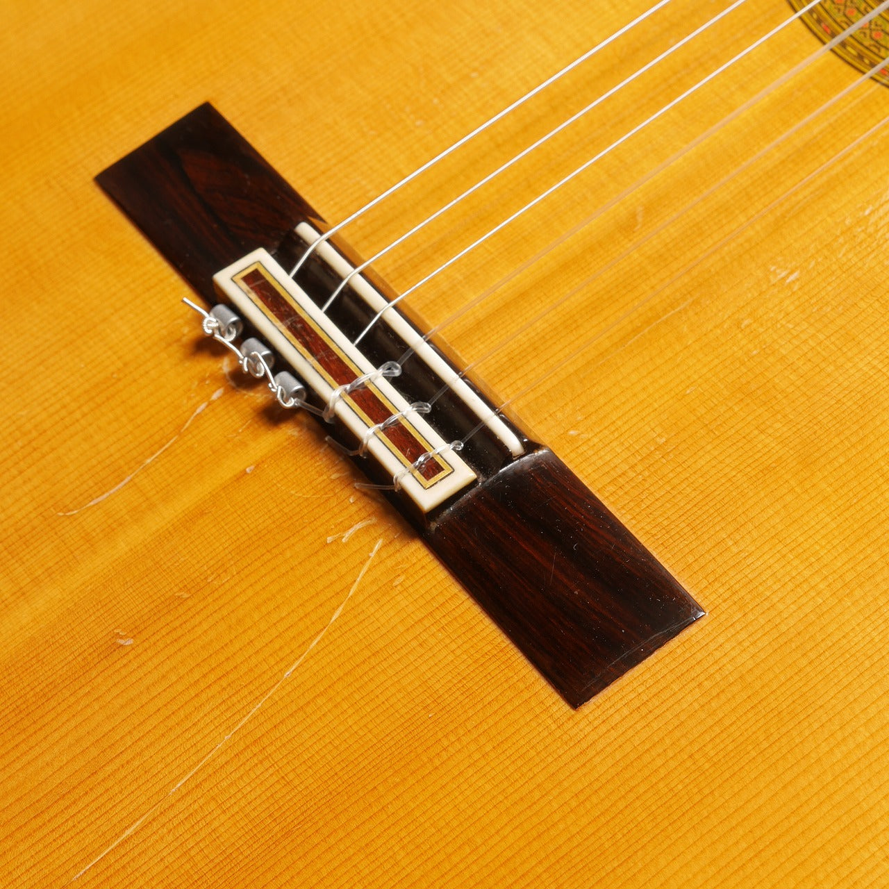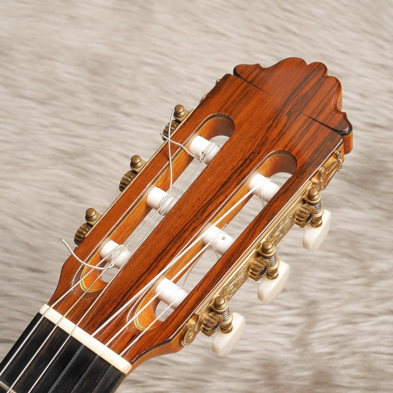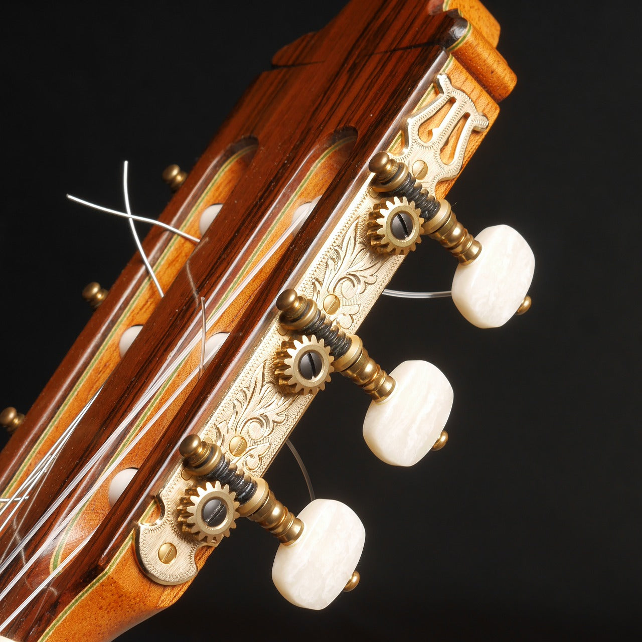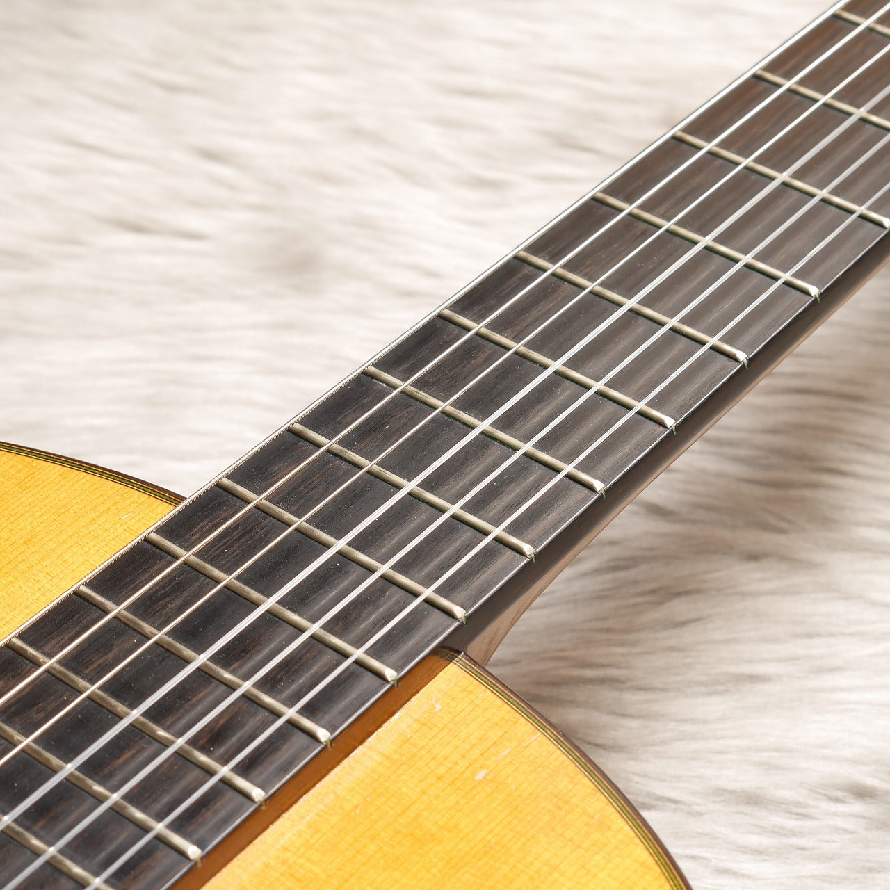 父譲りの確かな技術と、マドリッドの伝統的な音色への深い理解を持ち、力強く甘みのある、いわゆる「スペインらしい音色」のギターを製作し続けています。本器は、マドリッド派の伝統的な音作りを色濃く反映した、非常にパワフルで実用性の高い一本で、太く力強い音色が魅力です。