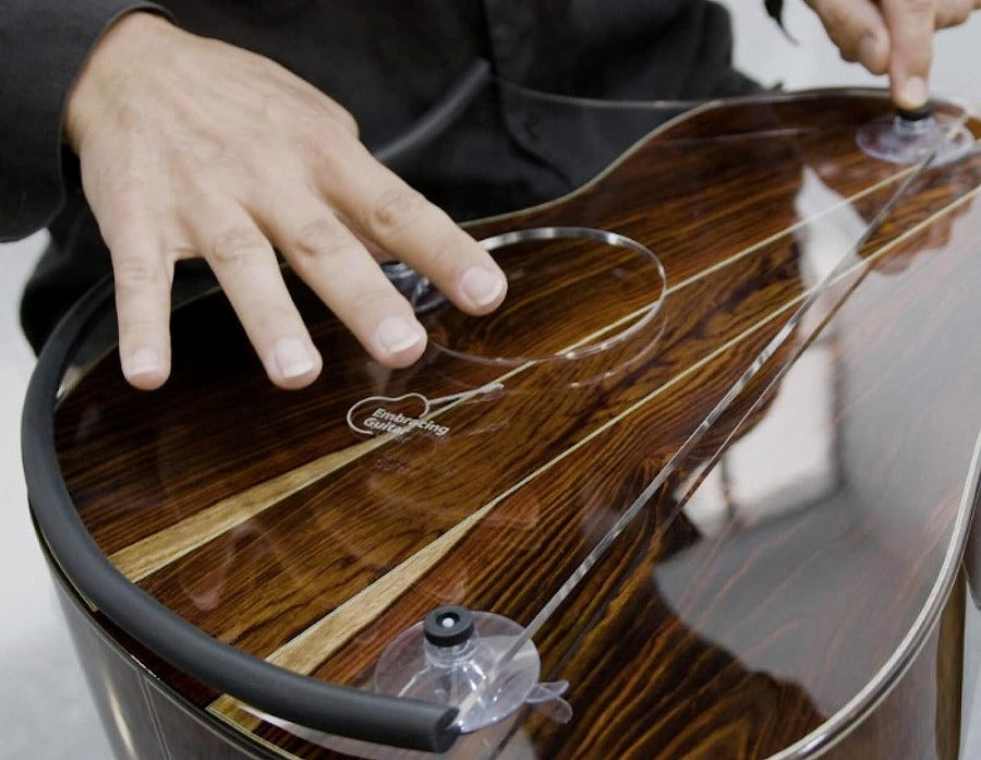 EmbracingGuitar では、人間工学に基づいたサポートを開発し、優れた安定性で楽器を好きな位置に置くことができる一方、プレイヤーは自由に動き、ギターを体の延長として感じることができます。
